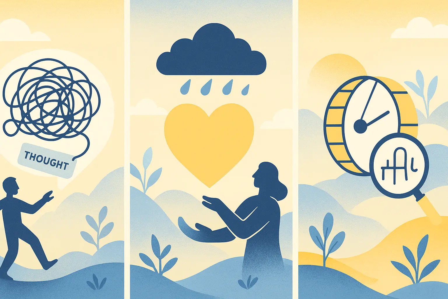 Skill-training fix: learn defusion. Instead of chasing silence, you practice noticing a thought, labelling it (“I’m having the thought that …”), and pivoting back to what matters. Research on Acceptance & Commitment Therapy shows that people who master defusion handle intrusive thoughts better—even when the mental noise never stops. Our chatbot walks you through a three-minute defusion drill you can run between meetings, no lotus position required.