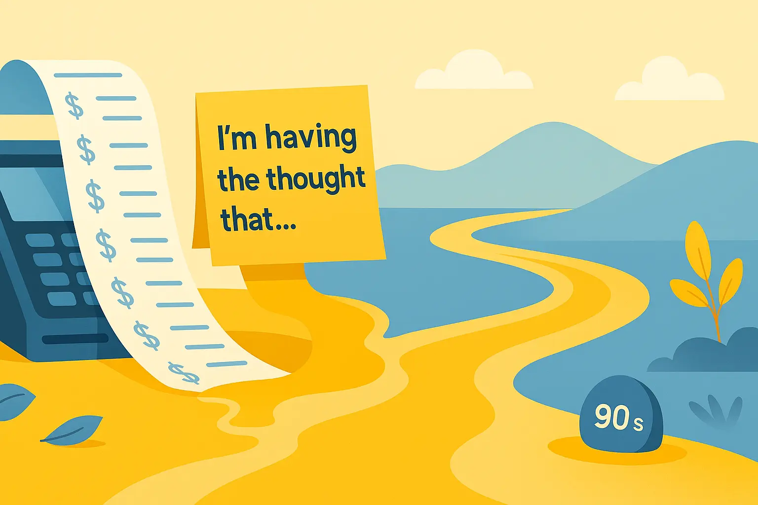 At the checkout (sticker shock): When you have the thought “this total means I’m failing at adulthood”, use the prefix and reframe it as “I’m having the thought that this total means I’m failing at adulthood.” Then take one small action, which could be removing a non-essential item or confirming the purchase, and then walk away from the aisle.